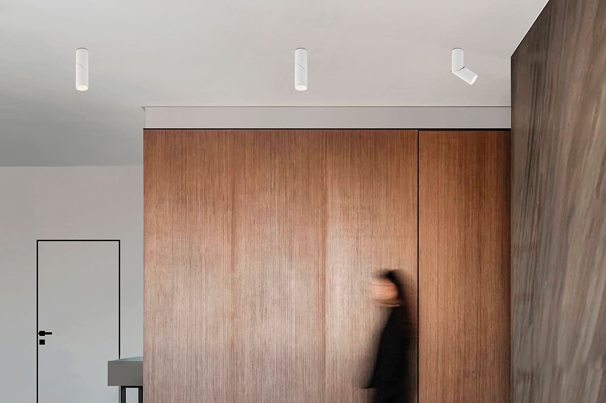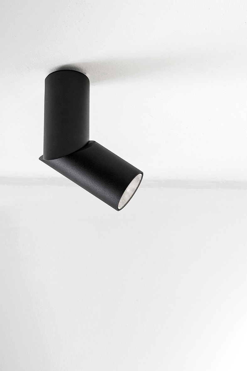 Apparecchio da soffitto con struttura in alluminio orientabile su un unico asse di 355? per direzionare il fascio di luce. Il design dello snodo centrale permette di ruotare il corpo illuminante di 90? o di mantenerlo fisso per personalizzare ulterio rmente l'illuminazione. Attacco GU10 che consente di montare lampadine LED.