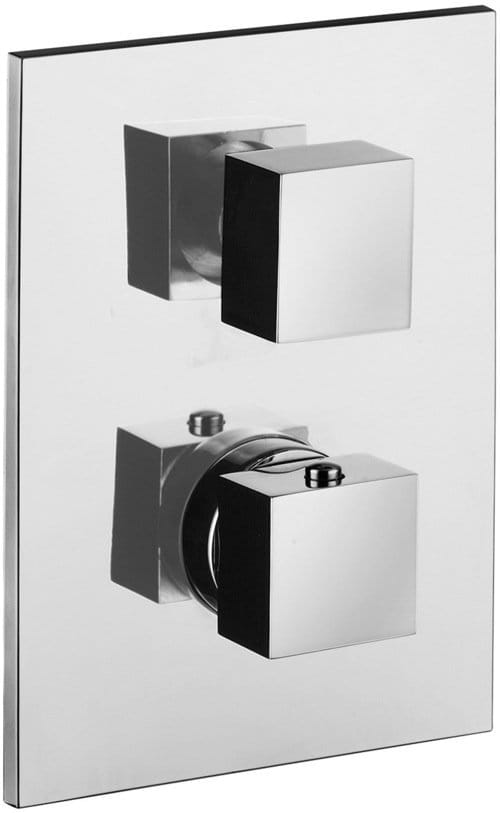 Miscelatore termostatico incasso doccia (2 uscite) con cartuccia deviatore (2 uscite + stop), completo di: • piastra 150x200mm • attacchi 1/2”G. Finitura Cromata