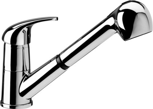 Miscelatore lavello monoforo con canna orientabile e con doccia estraibile (2 getti) in ABS, completo di: • set 2 flessibili inox 3/8”G • 1 flessibile inox M15x1 • 1 flessibile nylon 1/2”G x M15x1 cm. 150 con piombo. Finitura cromo