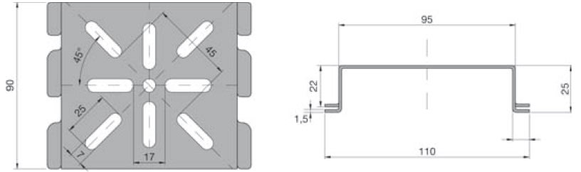 Supporto per scatola di derivazione MPG/G. In acciaio zincato Sendzimir. Per il fissaggio di scatole di derivazione alla passerella. Piegare le linguette sui fili.