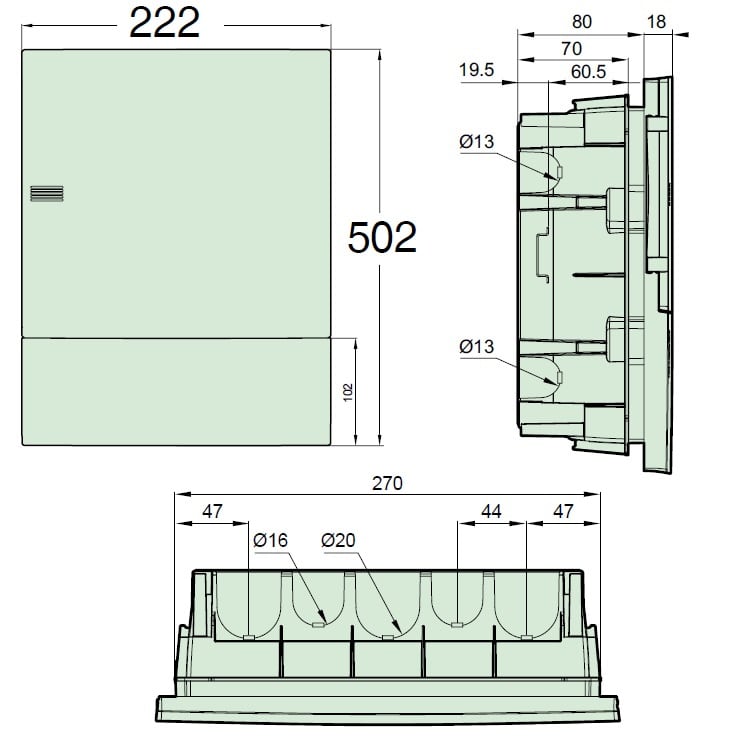 Questo prodotto Resi9 MP è composto da una parte anteriore trasparente e da una porta trasparente. È dedicato a 3 file di 12 moduli da 18 mm. Può ospitare tutti i tipi di commutatori modulari. La capacità totale nei moduli da 18 mm è 36. Le dimensioni sono (W) 294 mm x (D) 502 mm. È destinata a installazioni nuove o per ristrutturazione di edifici residenziali. Il materiale è una tecnoplastica autoestinguente appositamente sviluppata. La resistenza al fuoco e al calore anomalo è di massimo 650°C per la parte anteriore e la porta. Il grado di protezione urti meccanici è IK07. La temperatura di funzionamento va da -25°C a +60°C.