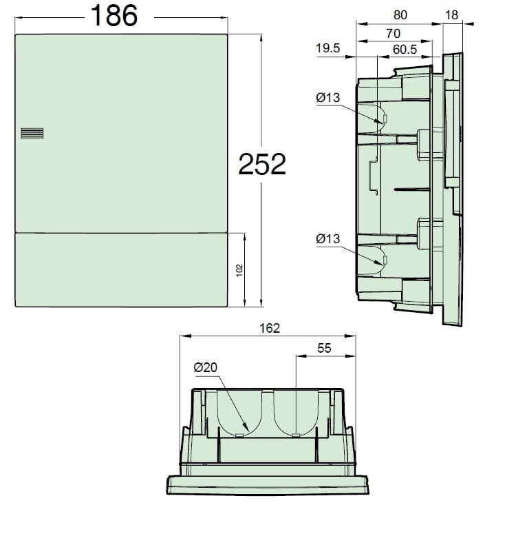 Centralini IP40 per apparecchiature modulari.Materiali Termoplastico autoestinguente.Halogen free.Grado di protezione IP40.Restistenza agli urti IK07.Restistenza al fuoco e al.calore anomalo.650°C.Temperatura d’impiego -25°C +70°C.