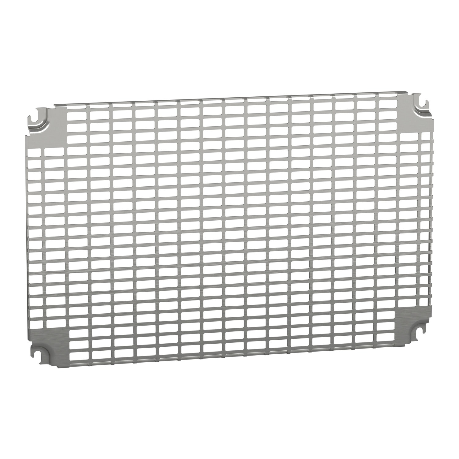 Piastre perforate monoblocco con fori universali per CRN, S3D, PLM. Per cassetta di A 400 x L 600 mm. Accessorio di montaggio multifunzione. Guida scorrevole o fissaggio diretto su perni posteriori (viti M8). Fori Telequick. Dimensioni foro: 11x26 mm. Inacciaio, finitura superficiale zincata. 450 fessure. La particolarità è l’installazione sul fondo della cassetta/armadio.