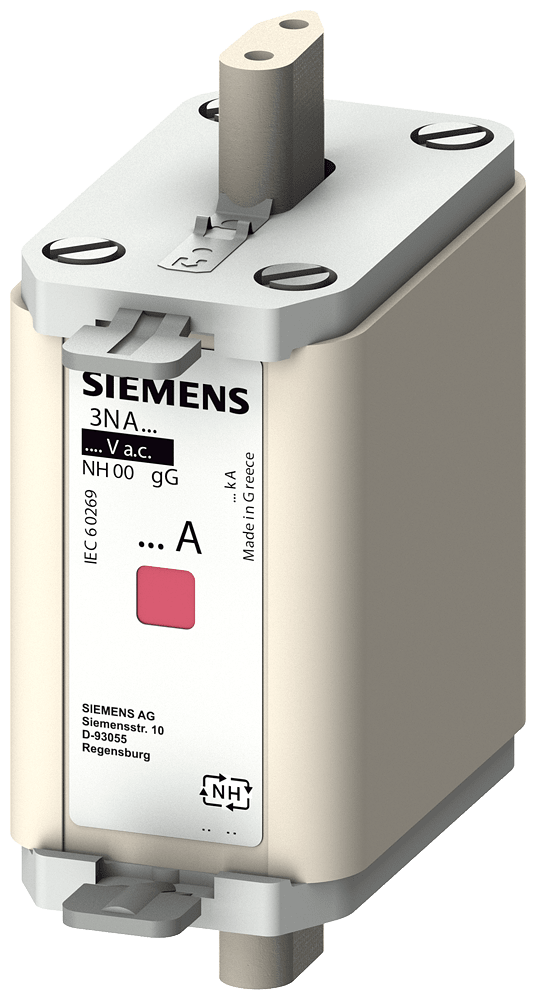 cartuccia fusibile NH, NH00, In: 63 A, gG, Un AC: 690 V, Un DC: 250 V, indicatore combinato, attacchi liberi da tensione Cartuccia fusibile NH SENTRON 3NA6 per la protezione selettiva dei cavi e dellimpianto. Il sistema di fusibili NH offre una protezione efficace per le persone, gli apparecchi e gli impianti grazie alla disinserzione sicura in caso di sovraccarico e cortocircuito. Segnalazioni combinate rivelano lintervento del fusibile mediante un chiaro cambio di colore da rosso a bianco. Le cartucce fusibili NH sono disponibili da 2 A a 1250 A e nelle grandezze costruttive 000, 00, 0, 1, 2, 3, 4 e 4a. Le varianti con funzione di comunicazione e di misura nella grandezza costruttiva 2 da 80 A fino a 315 A. Dispositivi di protezione SENTRON - Una scelta sicura. Ora ancora più intelligenti.