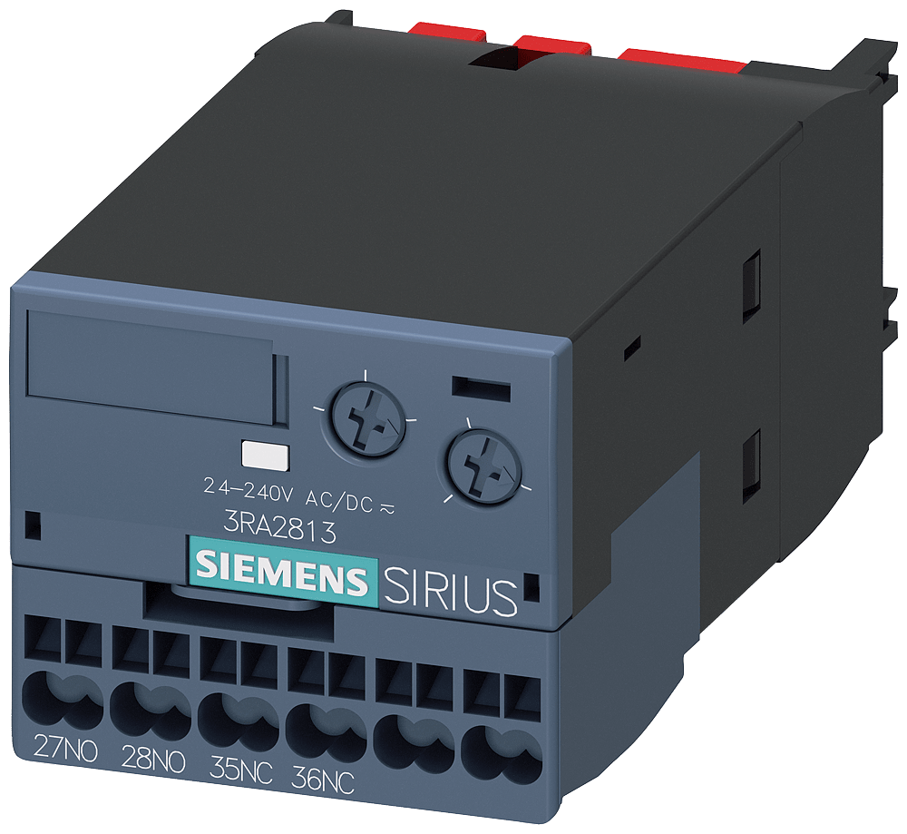 blocchetto di contatti ausiliari ritardato elettronicamente blocchetto di contatti ausiliari, ritardato alleccitazione, relè 1 NC + 1 NO, intervallo di tempo 0,05...100 s, AC/DC 24...240 V, 50/60 Hz, varistore per lo smorzamento delle bobine del contattore integrato, morsetti a molla, innestabile a scatto sul lato frontale per contattori 3RT20 e contattori ausiliari 3RH2 Blocchetto di contatti ausiliari ritardato elettronicamente SIRIUS 3RA28 per la commutazione ritardata di circuiti a valle per il montaggio su contattori 3RT2 e contattori ausiliari 3RH2. I blocchetti di contatti ausiliari ritardati elettronicamente offrono unelevata precisione di regolazione con campi dei tempi commutabili e dispongono di un interblocco elettrico integrato e di un varistore integrato lato fabbrica (circuitazione di protezione). Linserimento semplice e senza attrezzi consente la realizzazione di funzioni di temporizzazione indipendenti dallapparecchiatura di comando senza cablaggio addizionale. Si escludono così gli errori di cablaggio e si riducono i costi di collaudo. Grazie al montaggio frontale agli apparecchi si risparmia posto sulla guida DIN. Gli apparecchi sono impiegabili in tutto il mondo grazie ad approvazioni internazionali (ad es. IEC, CCC, UL/CSA). I blocchetti di contatti ausiliari ritardati elettronicamente sono fornibili per contattori 3RT2 e contattori ausiliari 3RH2 nelle grandezze costruttive da S00 a S3. Disponibili con un ampio campo di tensione AC/DC 24-240 V, uscite a scelta 1 NO + 1 NC o 1 CO e con morsetti a vite o a molla. Per i blocchetti di contatti ausiliari ritardati elettronicamente sono disponibili kit di cablaggio e una copertura piombabile. Relè SIRIUS - un programma per ogni evenienza.