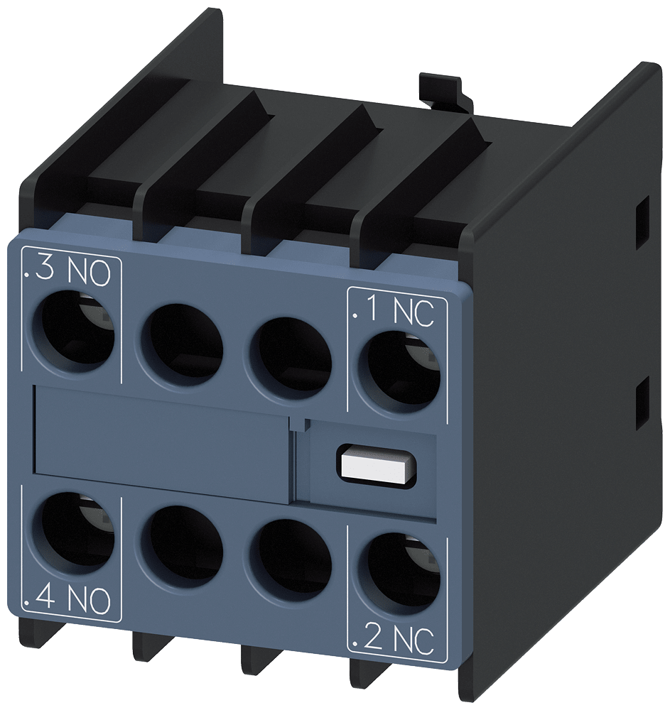 blocchetto di contatti ausiliari, compatibile con lelettronica, sul lato frontale, 1 NO + 1 NC, .3/.4, --/--, --/--, .1/.2, via di corrente: 1 NO (compatibile con lelettronica), --, --, 1 NC (compatibile con lelettronica), morsetti a vite, per contattori3RT2 e contattori ausiliari 3RH2 contatto ausiliario SIRIUS 3RH29 per lampliamento dei contatti ausiliari nel circuito di comando. I blocchetti di contatti ausiliari frontali 3RH29 possono essere montati senza attrezzi indipendentemente dalla grandezza costruttiva sui contattori 3RT2 e sui contattori ausiliari 3RH2. I blocchetti di contatti ausiliari 3RH19/3RH29 sono fornibili come varianti per il montaggio frontale o laterale, con fino a quattro contatti NO con commutazione istantanea o fino a due contatti NO e NC anticipati. I blocchetti di contatti ausiliari possono essere in esecuzione con elementi di contatto a guida forzata in contattori ausiliari 3RH o anche come contatti speculari in contattori di potenza 3RT. Essi sono sempre fornibili con morsetti a vite e morsetti a molla. Semplice, efficiente, sempre attuale - il sistema modulare SIRIUS.