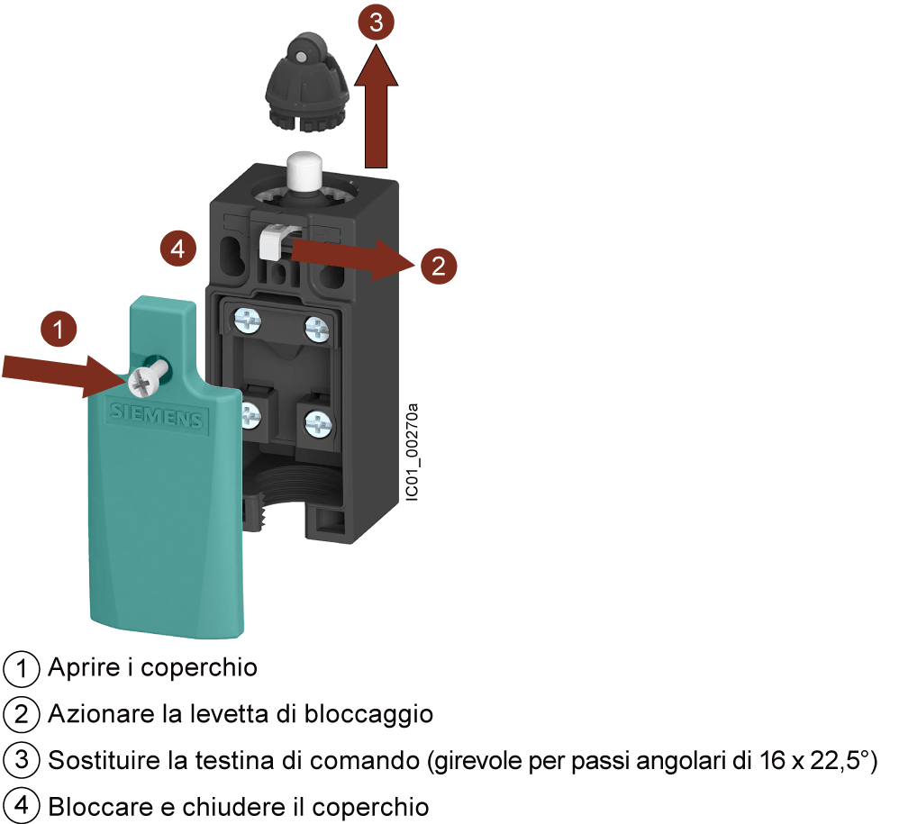 testina di comando per interruttore di posizione 3SE51 perno con rotella con sovracorsa da 3 mm rotella in acciaio inox 13 mm funzionante a -40 °C meccanismo di avanzamento per interruttore di posizionamento SIRIUS 3SE5 per il rilevamento di posizione diparti di macchina e per la sorveglianza della posizione di dispositivi di protezione per condizioni ambientali estreme fino a -40 °C, ad es. in impianti eolici, nellindustria dei generi alimentari o in applicazioni ferroviarie. Gli apparecchi sono adatti, grazie al grado di protezione elevato, allimpiego in condizioni ambientali estreme. Essi hanno una elevata protezione anticorrosione, sono a prova di urti e vibrazioni e hanno omologazioni internazionali (IEC, UL). Con le corrispondenti configurazioni di interruttore si possono soddisfare i massimi requisiti di sicurezza secondo PL e o SIL 3. Sono disponibili diverse grandezze di custodia in plastica o in metallo. Sono disponibili anche varianti con azionatore separato o con blocco di ritenuta. Come accessori sono disponibili, a seconda dellesecuzione, diversi dispositivi di azionamento nonché azionatori separati. Safety is a SIRIUS business.