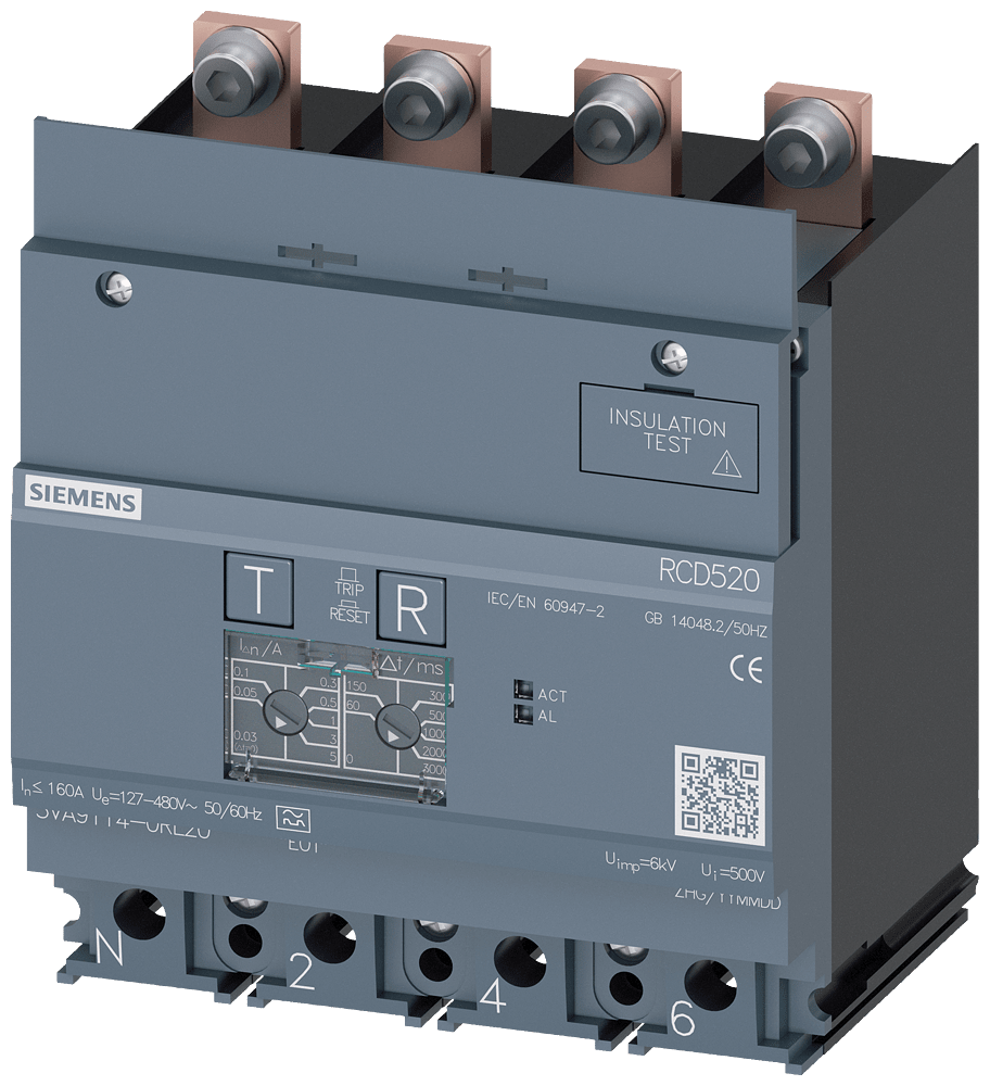dispositivo di protezione differenziale RCD520 Basic RCD Tipo A montato in basso corrente di guasto nominale 0,03 ... 5 A a 50/60 Hz tempo regolabile 0 ... 3000 ms a 4 poli In=160A Ue=100-480V Accessori per: 3VA1 Interruttori automatici scatolati SENTRON3VA - un sistema. Per tutte le applicazioni.