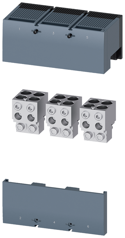 morsetto di collegamento per conduttore circolare TA4.3 4 x 120…240 mm² per 4 cavi con presa di tensione per conduttore ausiliario 3 pz. accessori per: 3VA15; 3VA25 Interruttori automatici scatolati SENTRON 3VA - un sistema. Per tutte le applicazioni.