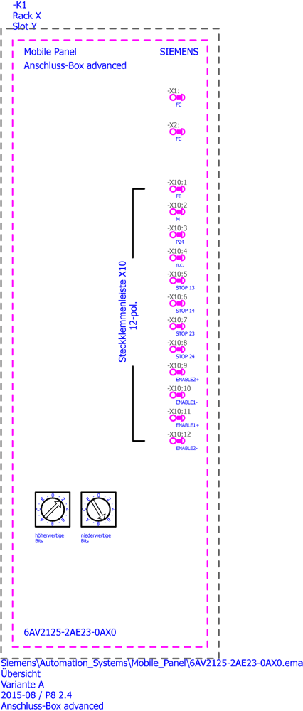 Box di collegamento SIMATIC HMI Advanced per Mobile Panel, Fissaggio a parete, PROFINET ePROFISAFE, Collegamento relè di sicurezza, Bypass circuito di arresto demergenza, Identificazione del punto di connessione, switch integrato, MRP Client, IRT Connessioni dei Mobile Panel.