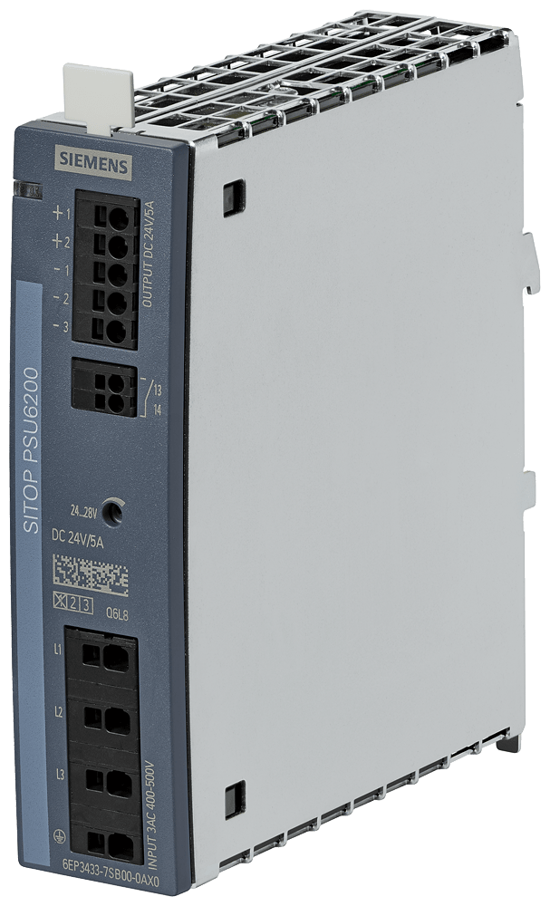 SITOP PSU6200 24 V/5 A alimentatore stabilizzato ingresso: AC 400 - 500 V uscita: DC 24 V/5 A I SITOP PSU6200 trifase sono alimentatori standard per requisiti tecnici elevati. Adatti per molteplici applicazioni, soprattutto nel campo industriale, come adesempio nella costruzione di macchine di serie. Il pregiato design della famiglia PSU6200 insieme ai morsetti push-in assicura un cablaggio efficace. La lunga durata di vita e lassoluta affidabilità potenziano la versatilità dei moduli di questa famigliadi prodotti. Il rendimento elevato in tutto il campo di carico e la riduzione al minimo delle perdite nel funzionamento a vuoto garantiscono un consumo energetico efficiente a salvaguardia delle risorse. Per un ulteriore aumento della disponibilità di 24V, gli alimentatori da rete SITOP PSU6200 possono essere combinati con moduli DC-UPS, di ridondanza e selettivi. Indipendentemente dal settore o dallesigenza, Siemens offre alimentatori affidabili ed efficienti per ogni impianto.