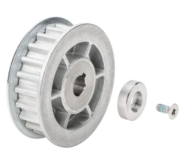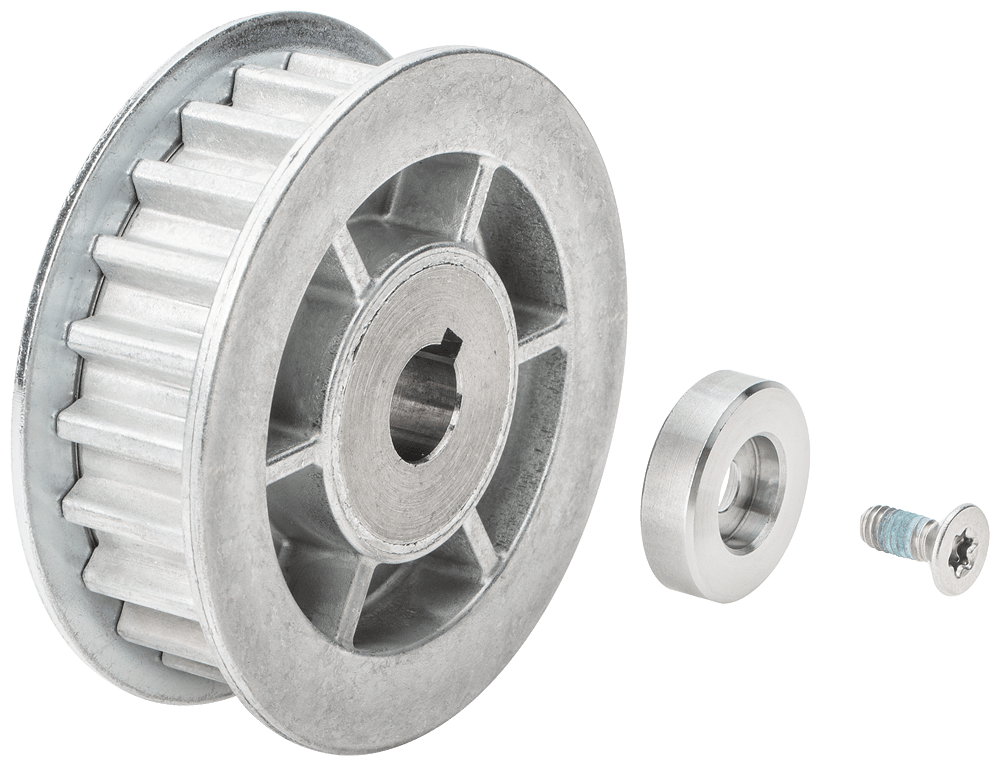 SIDOOR MDG-PULLEY 10-S8M-56, puleggia per motoriduttore DC MDG3 e cinghie dentate S8M, diametro effettivo 56 mm Accessori per i motori SIDOOR MDG, poiché questi sono forniti senza puleggia fissa. Con la puleggia SIDOOR MDG-PULLEY può essere utilizzato ilcompleto sistema di azionamento a cinghia SIDOOR. A seconda della forma di riduttore del motore SIDOOR MDG sono disponibili, in funzione dellalbero di uscita, una variante da 10 mm e una da 14 mm. Per il SIDOOR MDG3 è necessaria la variante da 10 mm mentre i dispositivi MDG4 e MDG5 necessitano della variante da 14 mm. Si possono impiegare le CINGHIE DENTATE SIDOOR STS-S8M con una larghezza di 12 mm e 14 mm, nonché un RULLO o DISPOSITIVO DI RINVIO SIDOOR incl. l’ANGOLARE DI MONTAGGIO SIDOOR 90° con dispositivo di bloccaggio. Il TRASCINATORE PORTA SIDOOR adatto (12 mm o 14 mm) chiude inoltre la cinghia e un secondo trascinatore porta può trascinare anche una seconda porta (che si muove in senso opposto).