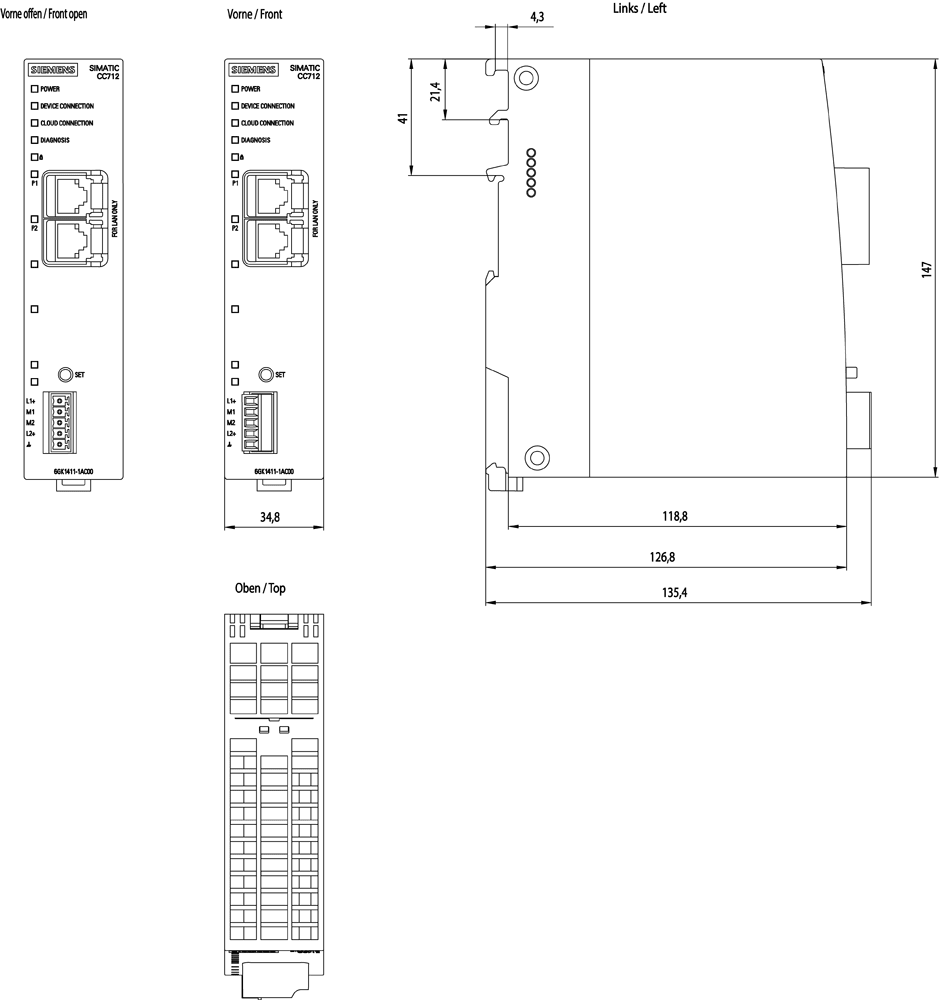 SIMATIC CloudConnect 7, CC712 gateway IoT per il collegamento di apparecchiature di automazione a Cloud Services e OPC 2x Ethernet RJ45 protocolli di campo: S7, S7-Plus, OPC UA, Modbus protocolli MES/Cloud: MQTT, HTTP, OPC UA SIMATIC CloudConnect 7, IoT Gateway CC 712 per il collegamento di controllori programmabili a servizi cloud e OPC 2x porte Ethernet RJ45, protocolli di campo: S7, S7-Plus, OPC UA, Modbus MES/Cloud. Protocolli: MQTT, HTTP, OPC UA