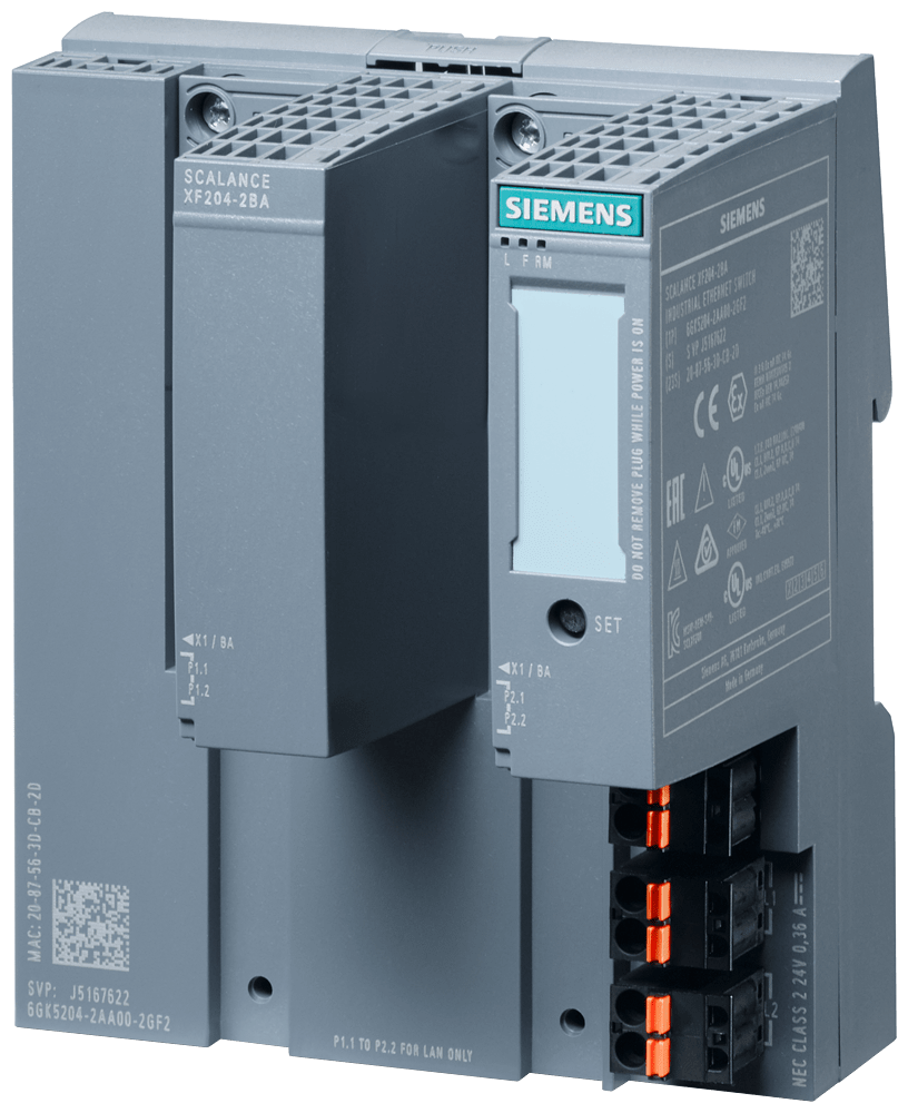 SCALANCE XF204-2BA managed IE Switch, 4 x 10/100Mbit/s, certificato IEC 62443-4-2; 2 x interfacce BusAdapter, contatto di segnalazione errore, tasto SET, DC 24 V ridondante alimentazione di tensione, apparecchio PROFINET, campo di temperatura ampliato -40°C ... +70 °C, Conformal Coating, con manuale elettr. su DVD, C-PLUG opzionale, fornitura senza BusAdapter. SCALANCE XF204-2BA managed, flat switch di Layer 2, 4x RJ45 da 10/100 Mbit/s, 2x interfacce BusAdapter per limpiego nel quadro elettrico nel design SIMATIC ET 200SP. Indicato per numerose applicazioni: Lo SCALANCE XF204-2BA offre unampia varietà di switch Ethernet altamente performanti in diverse varianti: dagli switch Gigabit agli switch robusti per i requisiti dellautomazione discreta e di processo. I potenti switch Gigabit SCALANCE XF204-2BA sono stati sviluppati per rispondere ai difficili requisitidelle reti negli ambienti industriali. Grazie allhardware potente e alle funzioni avanzate, assicurano uninfrastruttura di rete affidabile e scalabile per qualsiasi applicazione. Realizzazione semplice e affidabile di molte applicazioni industriali.