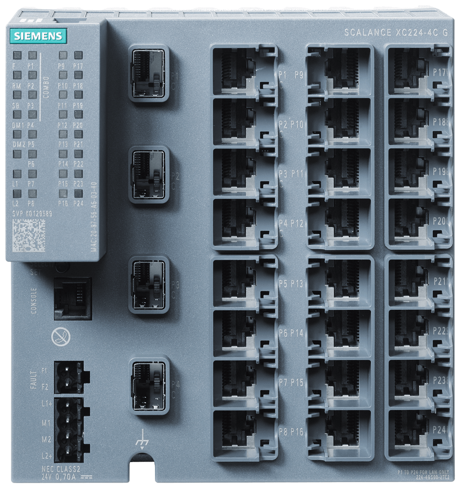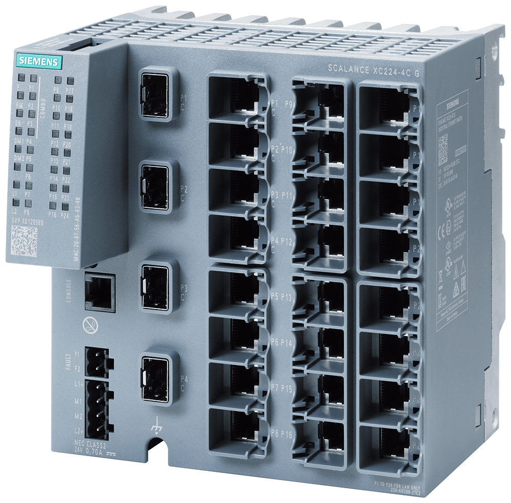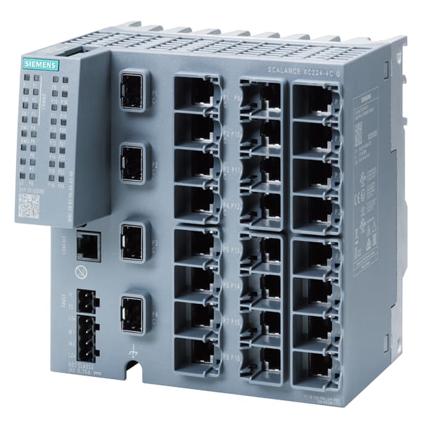 SCALANCE XC224-4C G manageable IE Switch di Layer 2; certificato IEC 62443-4-2; Full-Gigabit; 20x 10/100/1000 Mbit/s porte RJ45; 4x 1000 Mbit/s porte Combo (1000 Mbit/s SFP o porte RJ45 da 10/100/1000 Mbit/s utilizzabili); 1x porta console; LED di diagnostica; alimentazione di tensione ridondante; campo di temp.-40°C...+70°C; montaggio: su guida DIN/profilata S7/a parete; funzioni di ridondanza; Office Features (RSTP, VLAN,...); PROFINET IO Device; conforme a Ethernet/IP; slot C-PLUG; IEEE 1588v2 PTP SCALANCE XC224-4C G, managed switch di Layer 2, 20x RJ45, 4x porte combo (SFP/RJ45). Indicato per numerose applicazioni: Lo SCALANCE X224-4C offre unampia varietà di switch Ethernet altamente performanti in diverse varianti: dagli switch Gigabit agli switch robusti per i requisiti dellautomazione discreta e di processo. I potenti switch Gigabit SCALANCE X224-4C sono stati sviluppati per rispondere ai difficili requisiti delle reti negli ambienti industriali. Grazie allhardware potente e alle funzioni avanzate, assicurano uninfrastruttura di rete affidabile e scalabile per qualsiasi applicazione. Realizzazione semplice e affidabile di molte applicazioni industriali.