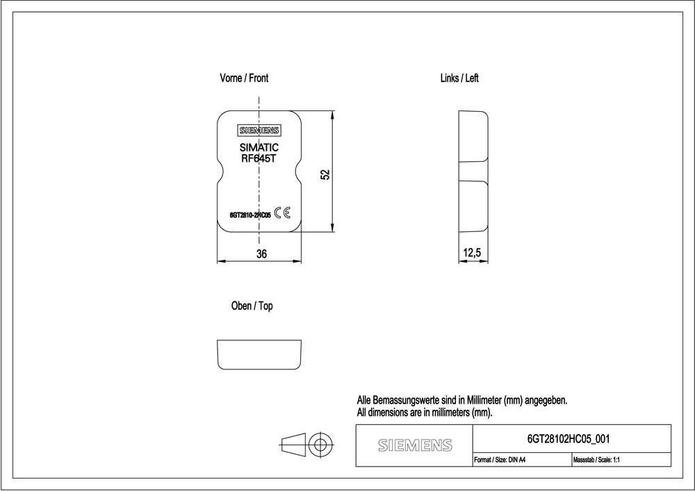 SIEMENS - SIE6GT28102HC05 SIMATIC RF645T, TRANSPONDER ON METAL - 6GT28102HC05