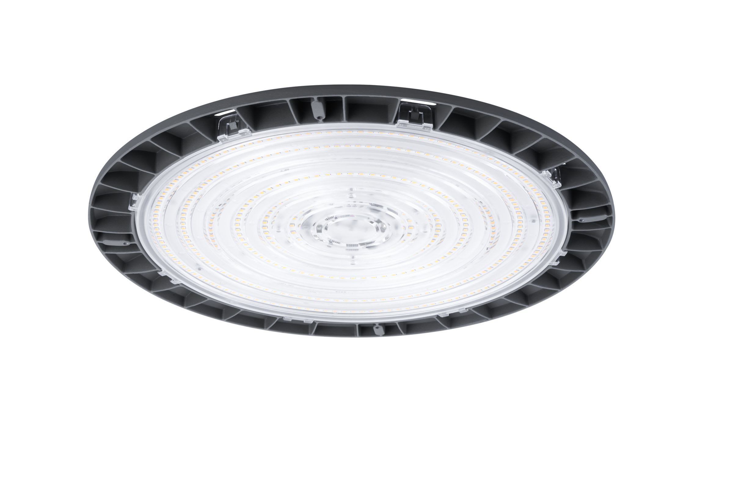 High-bay, D290 mm, Alluminio pressofuso, Grigio, Grigio traffico B (RAL7043), Unita di alimentazione (On/Off), 14000 lm, 100 W, 140 lm/W, 4000 K, (0.3825, 0.3798) SDCM?5, Angolo del fascio 90?, Opale, Policarbonato, Protetto contro la penetrazione di polvere, protetto contro i getti d'acqua, 2 J rinforzato, Classe di isolamento I, Unita di connessione 3 poli