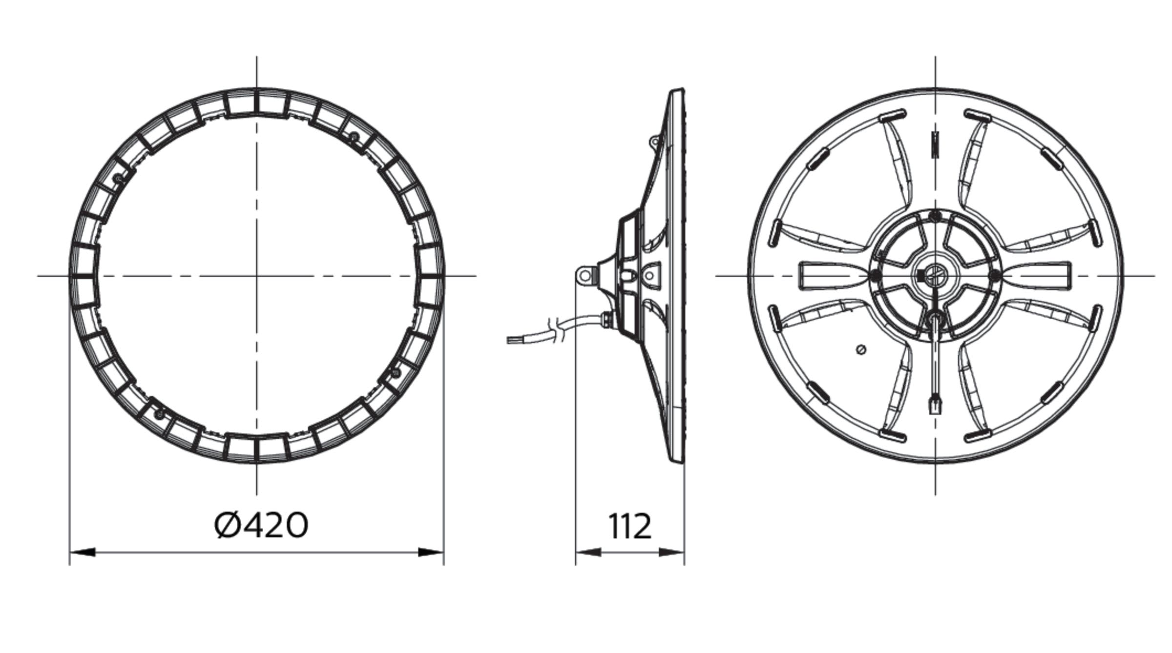High-bay, D420 mm, Alluminio pressofuso, Grigio, Grigio traffico B (RAL7043), Unita di alimentazione (On/Off), 28000 lm, 200 W, 140 lm/W, 4000 K, (0.3825, 0.3798) SDCM?5, Angolo del fascio 90?, Opale, Policarbonato, Protetto contro la penetrazione di polvere, protetto contro i getti d'acqua, 2 J rinforzato, Classe di isolamento I, Unita di connessione 3 poli