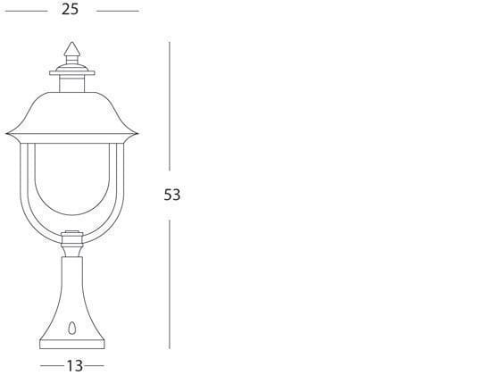 Paletto con struttura in pressofusione di alluminio. Copertura superiore in rame. Diffusore in termoplastico trasparente. Altezza max lampada: 150mm. Alimentazione 230 V ~ 50 Hz. Classe di protezione: IP43 Potenza massima lampade: 100W