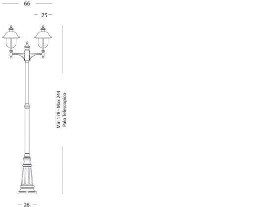 Palo con struttura in pressofusione di alluminio. Copertura superiore in rame. Diffusore in termoplastico trasparente. Triangolo di fissaggio a terra. Altezza max lampada: 150mm. Alimentazione 230 V ~ 50 Hz. Classe di protezione: IP43 Numero lampade: 2 Potenza massima lampade: 100W