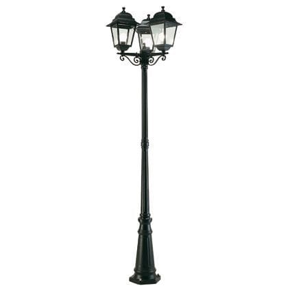 Palo in pressofusione di alluminio. Diffusori in vetro trasparente. Altezza max lampada: 210mm. Triangolo di fissaggio a terra. Alimentazione 230 V ~ 50 Hz. Classe di protezione: IP43 Numero lampade: 3 Potenza massima lampade: 100W