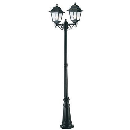 Palo in pressofusione di alluminio. Diffusori in vetro trasparente. Altezza max lampada: 210mm. Triangolo di fissaggio a terra. Alimentazione 230 V ~ 50 Hz. Classe di protezione: IP43 Numero lampade: 2 Potenza massima lampade: 100W