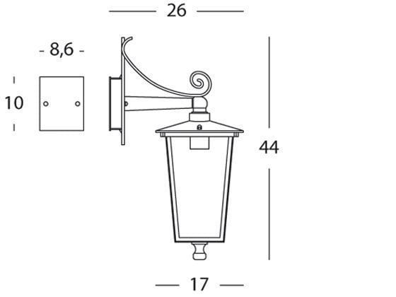 Struttura in pressofusione di alluminio. Diffusori in vetro trasparente. Controbase e accessori per il fissaggio. Portalampada in porcellana con attacco E27. Altezza lampada: max 185mm. Lampada esclusa. Alimentazione 230V ~ 50Hz. Classe di protezione: IP43 Potenza massima lampade: 60W