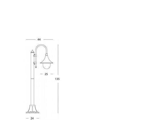 Palo in pressofusione di alluminio. Diffusore in termoplastico trasparente. Triangolo di fissaggio a terra. Altezza max lampada: 150mm. Alimentazione 230 V ~ 50 Hz. Classe di protezione: IP43 Potenza massima lampade: 60W