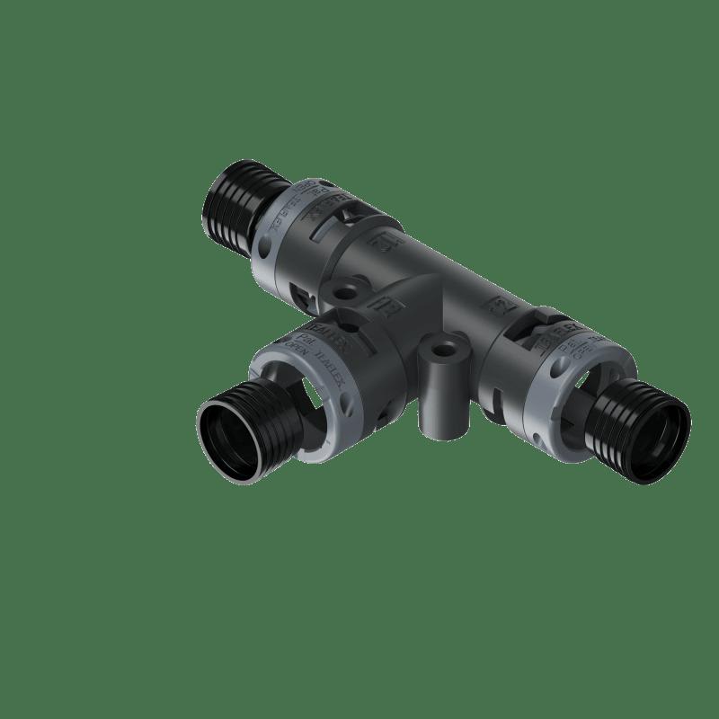 I raccordi di distribuzione della serie T sono stati progettati conlo specifico intento di dividere fasci di cavi in linee di derivazionimultiple. La forma a T permette l’inserimento e l’uscita dei cavida qualsiasi ingresso del raccordo consentendo collegamenti inlinea e a 90°.Soddisfano i requisiti standard nelle installazioni elettricheindustriali e nelle applicazioni tecniche ad elevate prestazioninell’industria pesante e nel settore ferroviario.