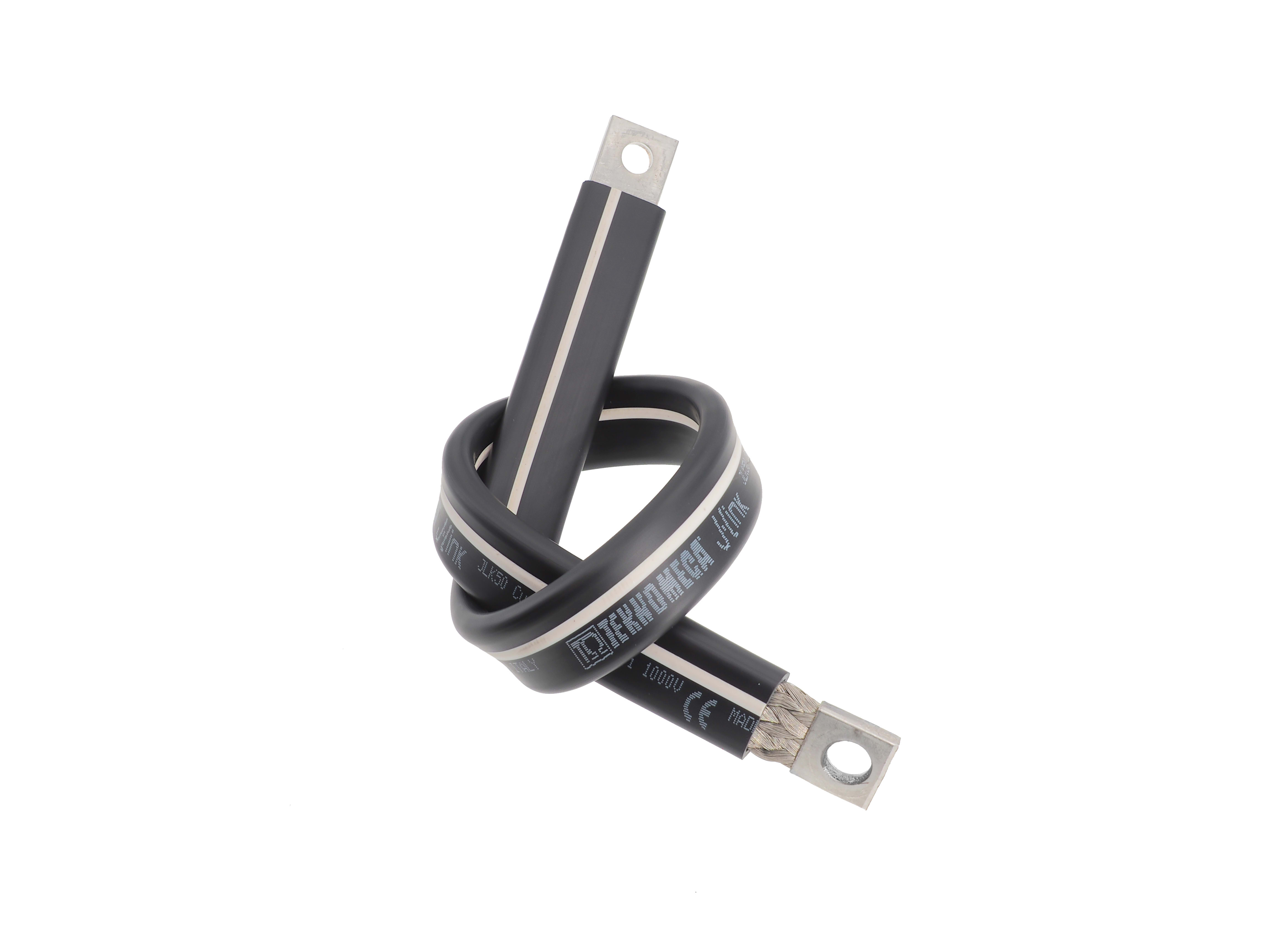 JLINK PLUS – Giunti in treccia Elevate prestazioni con J-LINK PLUS, dotata di isolamento in tecnopolimero privo di alogeni, ritardante di fiamma, a bassa emissione di fumi e iper flessibile. J-LINK PLUS è riconoscibile dalla riga azzurra. La temperatura massima di funzionamento continuo è di 140 °C. Sezioni: da 25 mm² a 240 mm² Lunghezze: da 230 mm a 1030 mm Portata nominale: da 125 A a 630 A Isolamento TPE compound Colore nero con riga azzurra Bassa emissione di fumi Autoestinguenza: UL 94-V0 Privo di alogeni Spessore: 1,9 mm Classe II secondo Par. 8.4.4 IEC 61439-1 Riciclabile Prodotto finito Rigidità dielettrica: 20 kV/mm Tensione nominale: 1000 V AC / 1500 V DC Temperature di lavoro: −40 °C ÷ +140 °C Conduttore Treccia in rame elettrolitico Cu-ETP 99,90% stagnato Filo elementare 0,20 mm Terminale in tubo di rame stagnato