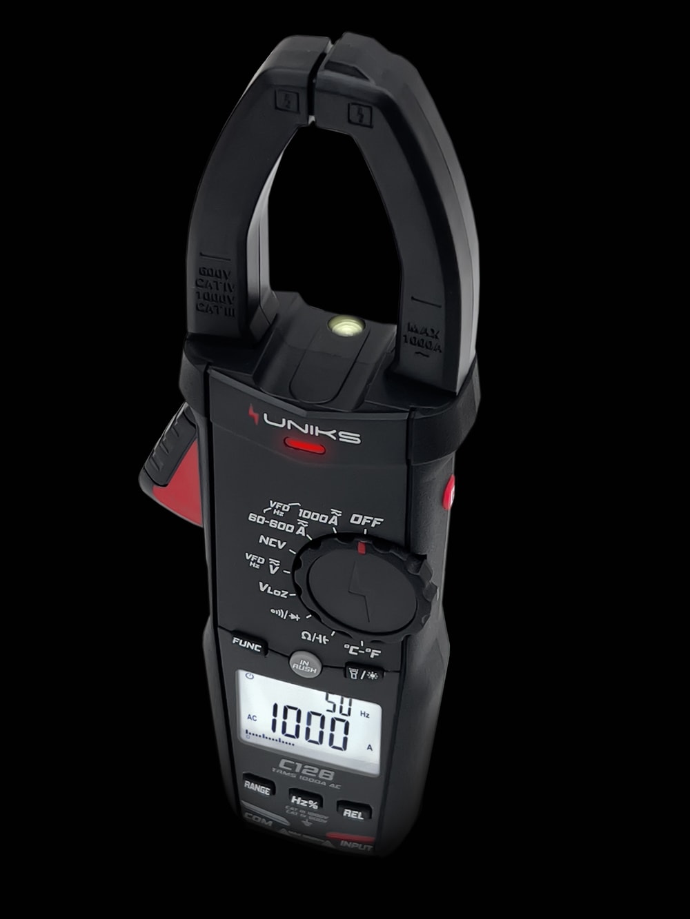 La pinza amperometrica Uniks C128 e pensata per l?utilizzo sia in ambito industriale che civileEffettua misure in TRMS di Tensione fino a 1000V AC/DC e Corrente da 0,1A fino a 1000A AC/DC.Il design moderno, le meccaniche fluide e il Display 2? con funzione DUAL DISPLAY facilitano il lavoro in campo rendendola la pinza piu completa della gamma.E? dotata di un rilevatore di tensione incorporato che si accende se posto in prossimita di conduttori attivi e di una torcia integrata che permette di lavorare anche in luoghi molto bui. FUNZIONI PRINCIPALIUniks C128 esegue le seguenti misure:Tensione DC/AC TRMS fino a 1000VCorrente DC/AC TRMS fino a 1000AValore minimo di corrente 0,1AInRush Corrente di SpuntoMisura della Tensione con Bassa impedenza VLozFiltro VFD in Tensione e in CorrenteResistenza e test di Continuita con cicalinoCapacita e frequenzaDuty cycleprova diodiTemperaturaLUCE LED E NCVLa pinza Amperometrica C128 permette di illuminare le zone piu buie grazie ad una Luce Led incorporata e tramite sensore NCV (rilevatore di tensione senza contatto) potra essere utilizzata per rilevare la presenza di tensione pericolosa tramite un LED ROSSO.