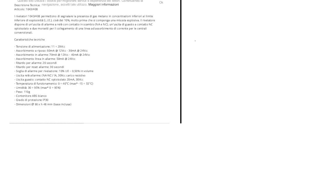Rilevatore di gas metano.I rivelatori 1043/408 permettono di segnalare la presenza di gas metano in concentrazioni inferiori al limite inferiore di esplosività (L.I.E.), cioè del 10%, molto prima che si componga una miscela esplosiva. Il rivelatore dispone di un’uscita di allarme a relè con contatto in scambio (NA e NC), un’uscita di guasto a contatto NC optoisolato e due morsetti per il collegamento di una linea ad assorbimento di corrente per le centrali convenzionali.