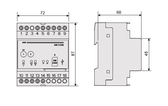 Interfaccia di comunicazione gSM, ALimentazione 11-28 Vac/ 15-40 Vdc. Uscita: Relè bistabile con contatto in scambio 8A/250 Vac, Un relè normalmente aperto 5 A/ 250 Vac. Due ingressi digitali.Un ingresso analogico • Modulo gsm quad band (900-950-1800-1900 MHz) • Compatibilità con sim card da 3V e standard GSM 11.12 phase 2+ • 60 numeri users memorizzabili + 10 numeri staff a cui mandare messaggi in caso di allarme • Comandabile gratuitamente tramite squillo telefonico • Possibilità di ricevere un sms di risposta ad ogni comando impartito • Batteria tampone che garantisce allo strumento un’autonomia di un’ora in caso di blackout • Possibilità di ricevere un sms nel caso di mancanza e ripristino alimentazione • Antenna gsm con lunghezza cavo 3 metri in dotazione • Porta USB per il collegamento al PC, con il quale effettuare la programmazione tramite apposito software (disponibile come accessorio).