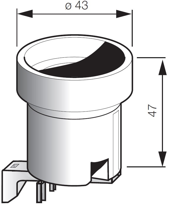 Portalampade E27, corpo porcellana cilindrico ø 43 mm, piastrina di fissaggio a squadra isolante, bianco. Asole di fissaggio ø 4,5x9 mm