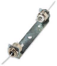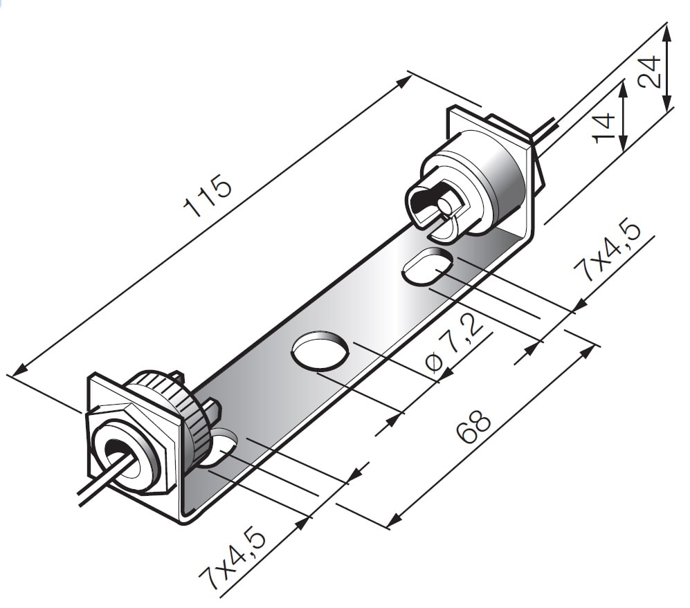 Portalampade cilindrico steatite 6 A 250 V con involucro in ottone nichelato attacco R7s per lampade alogene 150-250 W, 250 mm cavo teflon PTFE 0,75 mm2 - staffa di fissaggio dritta. Massima temperatura d’impiego continuo del portalampade 300 °C del cavo250 °C.Staffa con foro centrale ø 7,2 mm e asole 4,5x7 mm interasse 68 mm