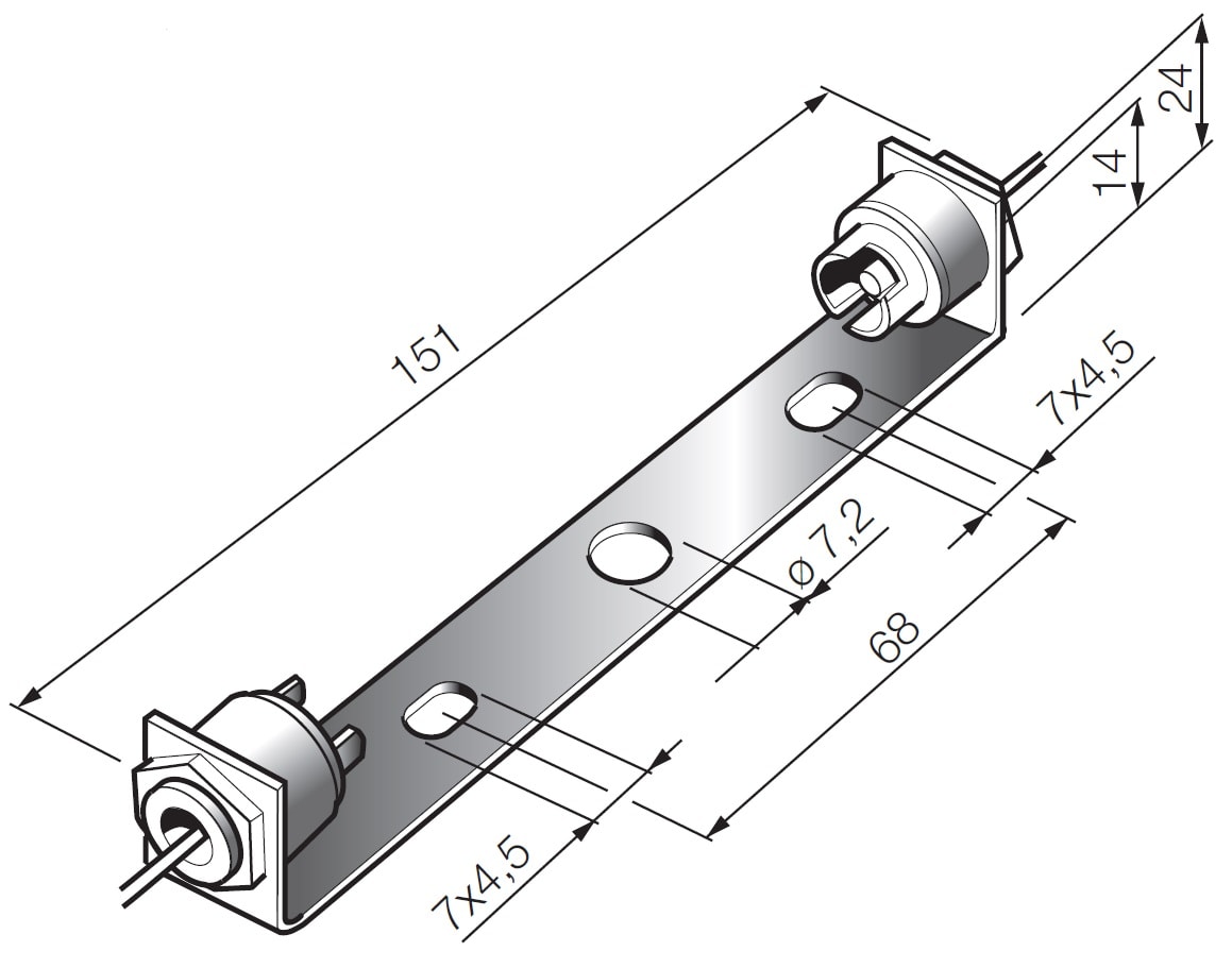 Portalampade cilindrico steatite 6 A 250 V con involucro in ottone nichelato attacco R7s per lampade alogene 300-500 W, 250 mm cavo teflon PTFE 0,75 mm2 - staffa di fissaggio dritta. Massima temperatura d’impiego continuo del portalampade 300 °C, del cavo 250 °C.Staffa con foro centrale ø 7,2 mm e asole 4,5x7 mm interasse 68 mm