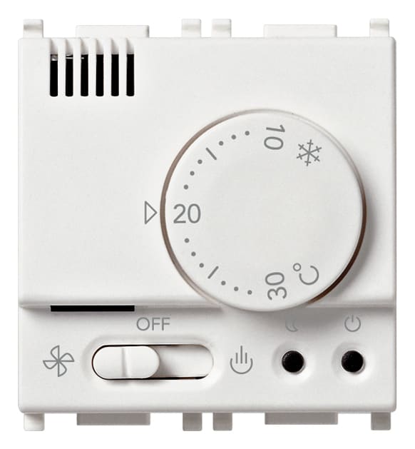 Termostato elettronico per controllo temperatura ambiente (riscaldamento e condizionamento), commutatore estate/off/inverno,ingresso per l’attivazione a distanza della funzione “risparmio energetico”, uscita a relè in scambio 6(2) A 230 V~, alimentazione120-230 V~ 50-60 Hz - 2 moduli. BIANCO