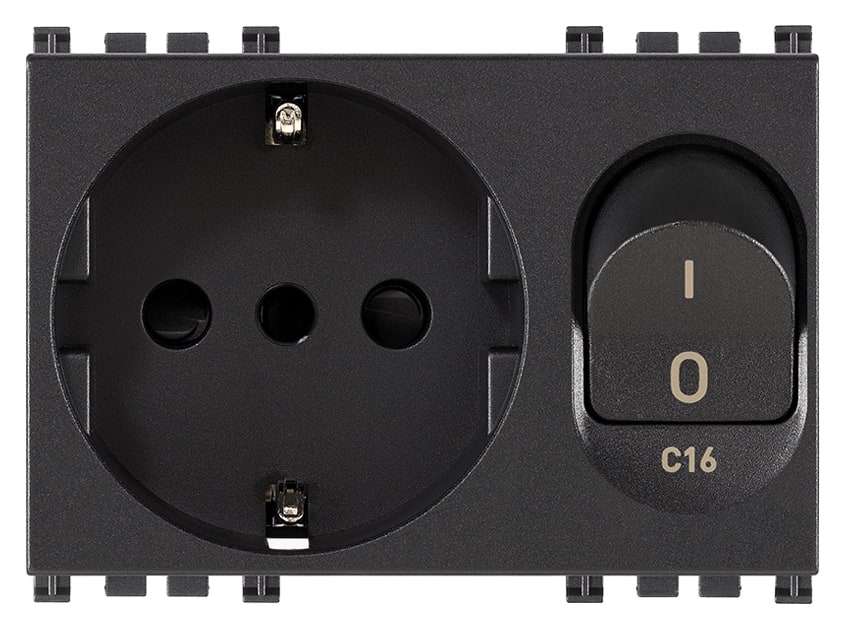 Presa SICURY 2P+T 16 A standard italiano tipo P30 (contatti di terra laterali e centrale), interbloccata con interruttore automatico magnetotermico 1P+N C 16, 230 V~ 50 Hz, p.i. 3000 A, grigio - 3 moduli