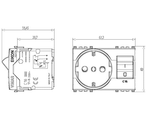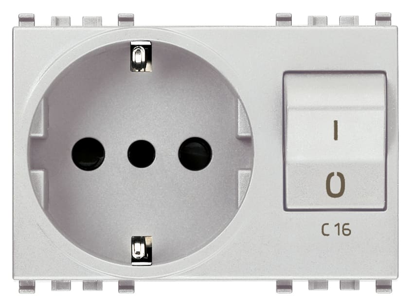 Presa SICURY 2P+T 16 A standard italiano tipo P30 (contatti di terra laterali e centrale), interbloccata con interruttore automatico magnetotermico 1P+N C 16, 230 V~ 50 Hz, p.i. 3000 A, Next - 3 moduli