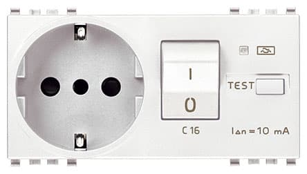 Presa SICURY 2P+T 16 A standard italiano tipo P30 (contatti di terra laterali e centrale), interbloccata con interruttore automatico magnetotermico differenziale 1P+N C 16, 230 V~ 50 Hz, I¿n 10 mA, p.i. 3000 A, bianco - 4 moduli
