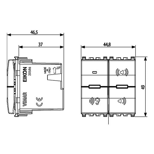 Microfono per chiamata selettiva o generale, funzione di attivazione con la voce per il controllo dei bambini (Baby Control) e ascolto ambientale - 2 moduli. Il dispositivo permette di rilevare e trasmettere sul bus del sistema di diffusione sonora il segnale vocale captato dal microfono frontale in modo da attivare le funzionalità di Chiamata Generale, Chiamata Selettiva, Baby-Control o Ascolto Ambientale. In caso di chiamata le zone coinvolte diffondono il segnale audio relativo alla chiamata stessa; al termine di quest’ultima ogni zona riprende il funzionamento immediatamente precedente alla chiamata. Il tasto basculante destro inoltre, può anche essere configurato per effettuare funzioni diverse da quelle standard di Chiamata Generale e Selettiva e può essere utilizzato come comando automazione (controllo luci, tapparelle, ecc.) o per altre funzioni audio legate alla diffusione sonora. Bianco.
