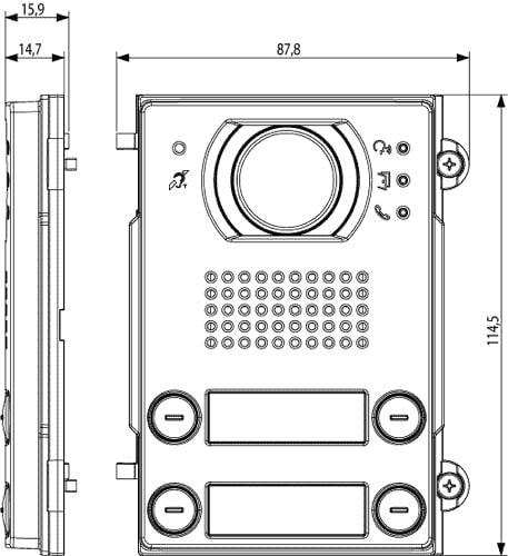 Modulo frontale audio/video con 4 pulsanti in doppia fila e simbolo teleloop per protesi acustiche, Pixel Heavy, per unità elettronica audio 41004, grigio sablé. Protezione agli impatti meccanici esterni IK10, grado di protezione IP54.