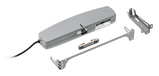 Attuatore a doppia catena articolata 230 V~ per motorizzazione finestre, carico massimo 300 N, corsa selezionabile 200 o 380 mm, completo di supporto ed accessori per apertura a vasistas, a sporgere e cupole, grigio