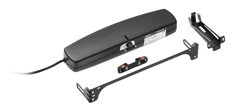 Attuatore a doppia catena articolata 230 V~ per motorizzazione finestre, carico massimo 300 N, corsa selezionabile 200 o 380 mm, completo di supporto ed accessori per apertura a vasistas, a sporgere e cupole, nero