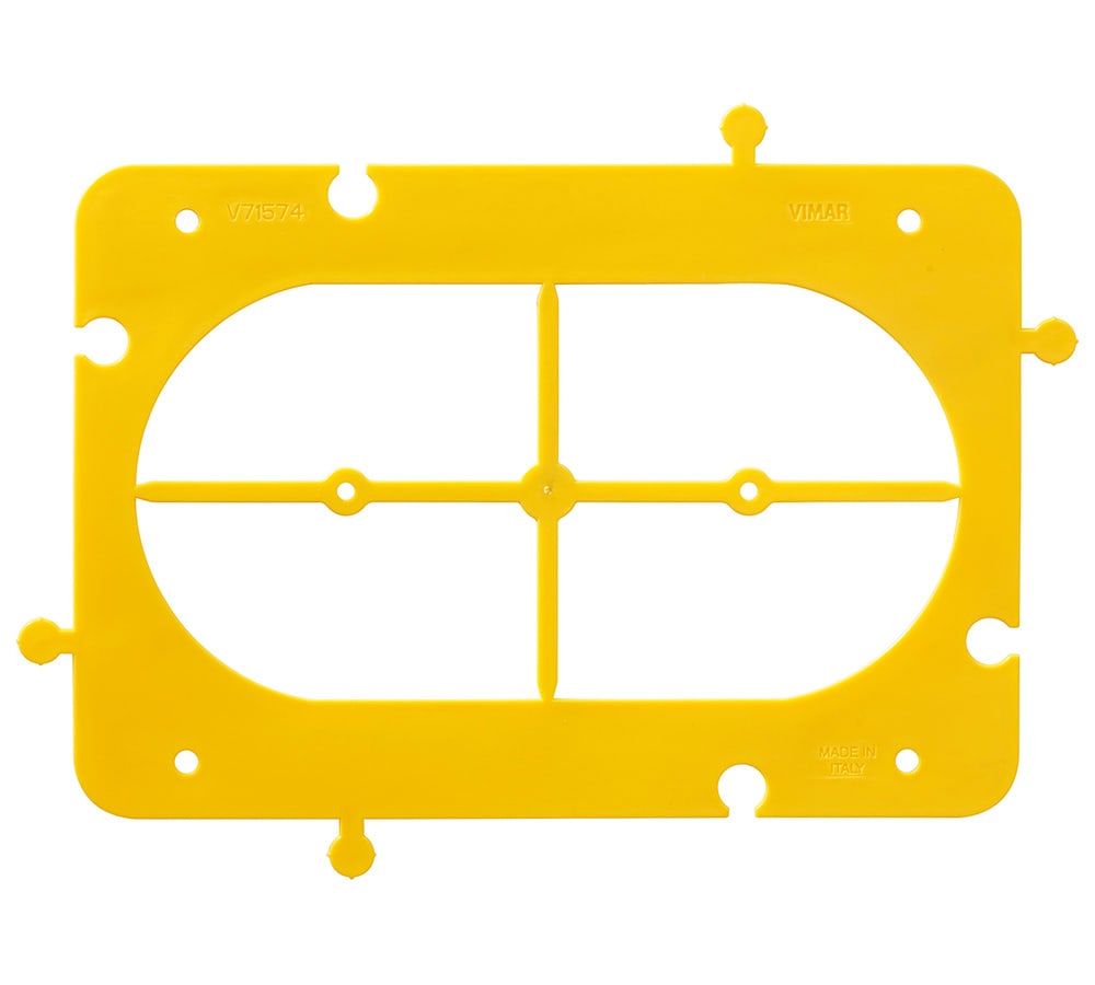 Accessorio multifunzione: supporto per installazione di scatole 4 moduli per pareti leggere sul lato interno della parete, dima di centraggio e giunto di unione per montaggio di scatole in batterie orizzontali e verticali.