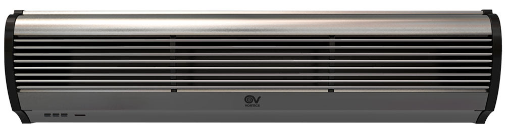 Barriere d’aria per installazione orizzontale fissa in corrispondenza delle porte e, più in generale, delle zone di accesso di locali pubblici, negozi, supermercati o centri commerciali, generano una lama d’aria che ostacola l’ingresso di aria esterna a temperatura diversa da quella desiderata. Particolarmente indicate anche per prevenire l’ingresso di fumo, smog o insetti ed evitare la diffusione di odori tra ambienti contigui. Involucri caratterizzati da pannelli frontali in alluminio spazzolato di colore grigio argento integranti la griglia di aspirazione; pannelli posteriori in lamiera d’acciaio verniciata nera; fianchetti in resina plastica nera. Ventilatori tangenziali, a garanzia di bassi livelli di emissioni sonore, azionati da motori asincroni bialbero a due velocità per il miglior compromesso tra prestazione erogata, temperatura del flusso d’aria generato (nel caso dei modelli con batteria elettrica), e livello di emissione sonora. 2 velocità di funzionamento. I modelli AIR DOOR H hanno batterie elettriche a termoresistori (PTC) caratterizzate da elevate rese termiche e ridotta resistenza aerodinamica, protette contro sovratemperature e picchi di tensione. La specifica logica di funzionamento, che ritarda di 30” l’arresto del ventilatore dopo lo spegnimento della resistenza, contribuisce al loro affidabile funzionamento nel tempo. Alette orientabili, montate in corrispondenza della zona di fuoriuscita dell’aria, permettono di orientare il flusso generato. Consentono risparmio nei consumi perchéevitano la creazione di variazioni termiche e di dispersioni: anche i climatizzatori (in estate) o i riscaldamenti (in inverno) lavorano in modo più efficace, risparmiando a loro volta il proprio consumo. Sono utilizzabili in tutte le stagioni: sono modelli in versione neutra. Grande flessibilità di installazione: la posizione frontale della griglia di aspirazione consente il montaggio anche a ridosso del soffitto nei locali di altezza ridotta (minimo 2.55 m). Facilità e rapidità di installazione, graziealla pratica staffa in dotazione. Possibilità di installazione in serie, per coprire aperture di elevata larghezza. Abbinabili a sensori porta standard presenti sul mercato. Classe di Isolamento: Cl.I .