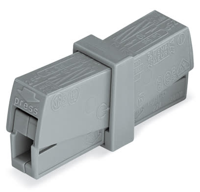 Service-Klemme; Drücker beidseitig; Leuchtenseite: für alle Leiterarten; Inst.-Seite: für eindrähtige Leiter; Serie 224; max. 2,5 mm²; Umgebungstemperatur max. 60°C; 2,50 mm²; grau
