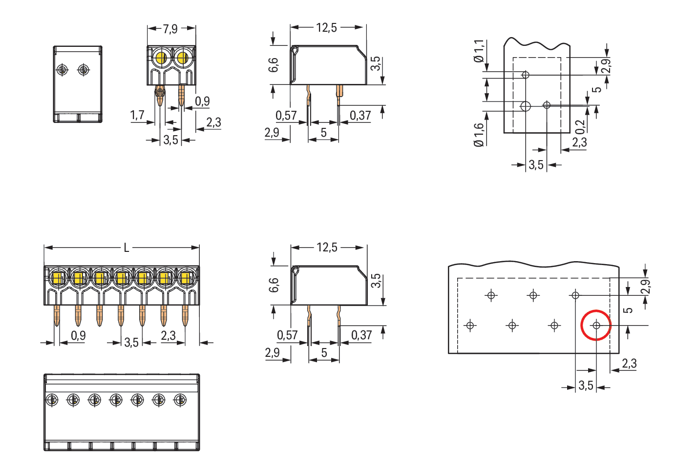 • Winkel Leiterplatte/Leiteranschluss - 0°/180° (horizontal)