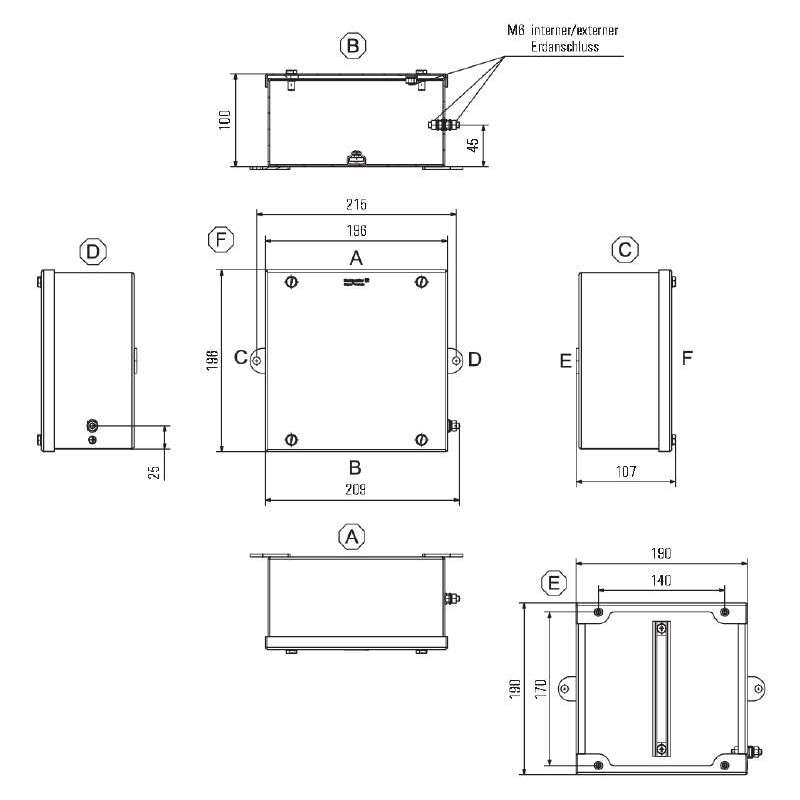 Custodia in metallo adatta all'uso in zone a rischio di esplosione. I fori per il montaggio sono posti all'esterno dell'area di tenuta stagna. Il montaggio a muro può essere realizzato utilizzando fori di montaggio o piedini di montaggio.