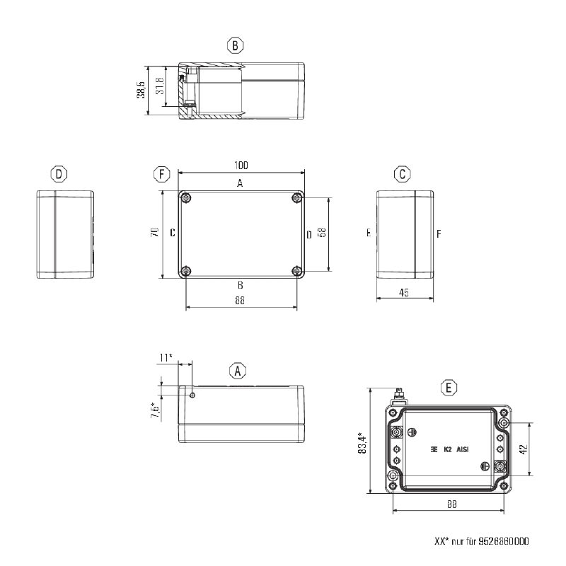 Custodia in metallo adatta all'uso in zone a rischio di esplosione. I fori per il montaggio sono posti all'esterno dell'area di tenuta stagna. Il montaggio a muro può essere realizzato utilizzando fori di montaggio o piedini di montaggio.